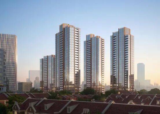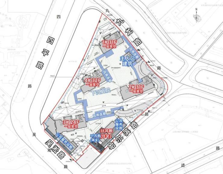 具体来看,1#总高31层,一层架空;2#总高31层,一层架空;4#总高32层,一层架空;3-1#总高24层,一层架空;6为风貌建筑,总高3层,含商业和住宅。在景观设计方面,小区内规划了景观架构、风雨连廊以及下沉式庭院。