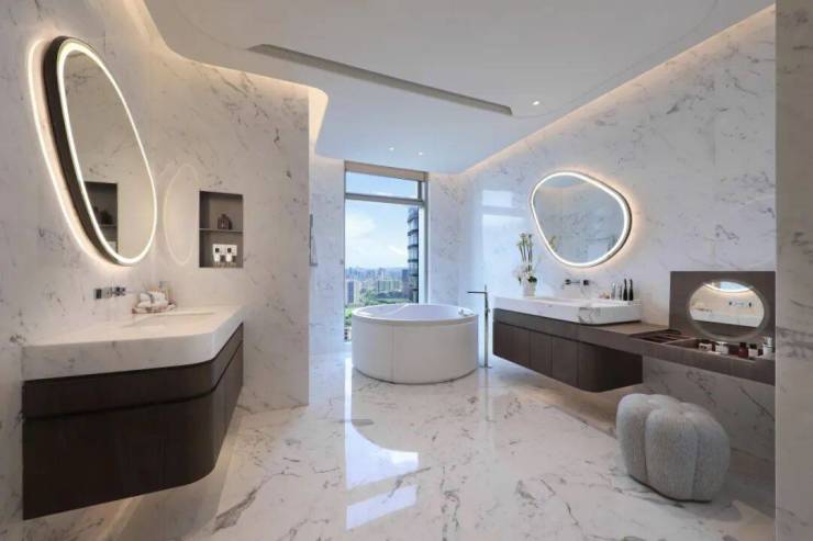 样板房蕴藏高级定制理念,从电梯厅与玄关创新一体化格局,到堪比六星级总统套房的主卧,皆是如此。尤其是主卧内嵌式衣帽间,装得下一个巴黎的当季时尚,搭配卫浴专属化妆台,每次出门都从容、优雅。