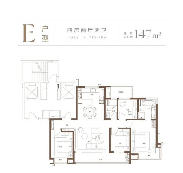 作为压箱底的面积约147㎡户型,强调“户型与外部环境互动的属性”。南向约15米的豪华开间,大尺度景观玻璃。