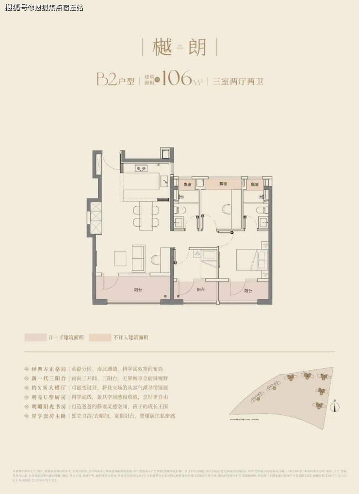 大华望樾建面约94㎡高层户型居然做到了三阳台的配置,远远超过新规标准。