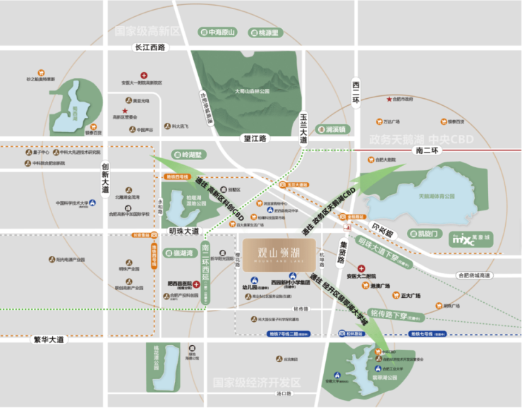 观山嶺湖位于政务、高新、经开交汇处,距离政务区直线不到三公里,这个位置不仅离政务区很近,依托“三纵三横一轨道”的交通路网,创新大道直达蜀西湖、繁华大道直达经开和滨湖、集贤路串联方兴大道和西二环等多条主干道,到经开、高新、蜀山,甚至滨湖和庐阳等区域都很快捷。