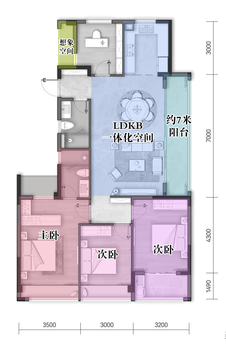 东面连接约7米阔绰阳台,套房式主卧,带飘窗、衣帽间和卫生间,全面覆盖男女主人的生活所需。周末坐在飘窗上看书喝茶,累了就靠枕小憩,还可设计为收纳的地方,为空间扩容。