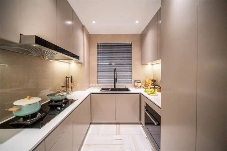 厨房北向开窗,易于通风,让业主免受油烟困扰。未来可设计成U型操作台,合理划分各功能区,“取、洗、切、炒”一气呵成,让做饭的动线更为流畅。