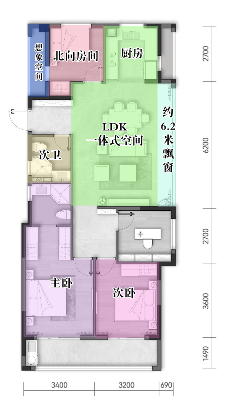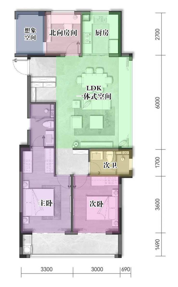 主卧套房设计,带飘窗和独立的全明卫生间,早上洗漱整理,搭配衣服和鞋帽也不再匆忙。次卧约3米的开间,安置一张1.8米大床,空间也不拥挤压抑。北向的房间,配以大玻璃窗,鲜氧涌入,空气流通,可改造成学习、办公的空间,还可以用来娱乐休闲。该户型自带2个设备平台,空间敞阔,灵活百变,置放完家庭中央空调的外机等设备之后,富余空间同样能随心而设。