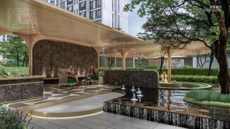 比如“原生围合社区”、风雨连廊,从高奢酒店中获得灵感的酒店式落客区、度假风园林,以及千万级住宅中都不多见的下沉式会所!