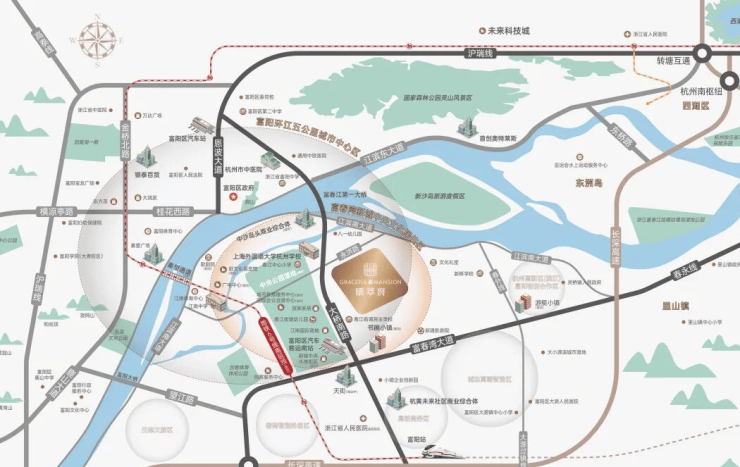 规划城市轨道距项目约1km,富阳高铁站距离项目约3km,杭新景高速灵桥闸口约5.5km(项目出发驾车—之江银泰约28分钟,驾车—滨江天街约35分钟);
