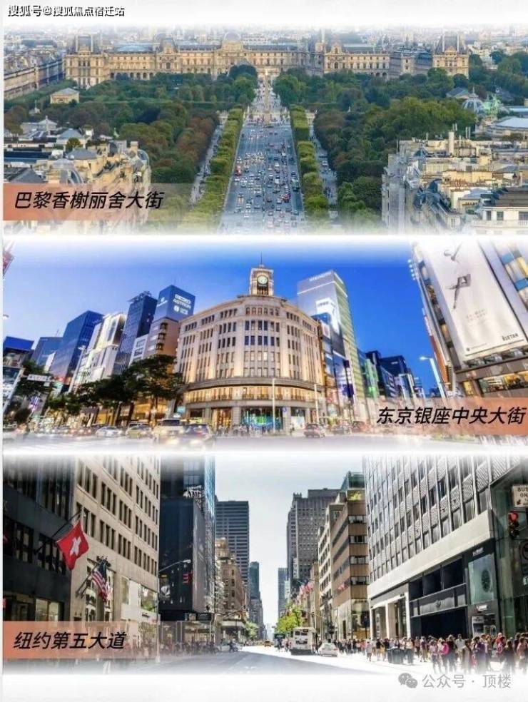 商铺顶级对标:项目对标世界三大商圈,巴黎香榭丽舍大街、东京银座中央大街、纽约第五大道,进行同级别的商业规划及氛围布置。