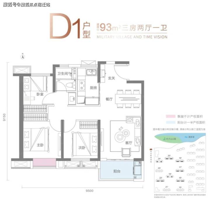 D1户型建面约90-93平,三房两厅一卫: