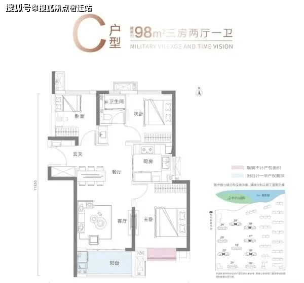 C户型建面约98平,三房两厅一卫:
