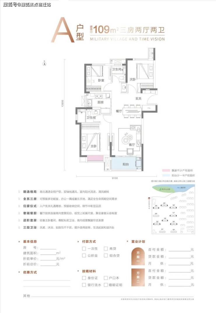 A户型建面约109-113平,三房两厅两卫: