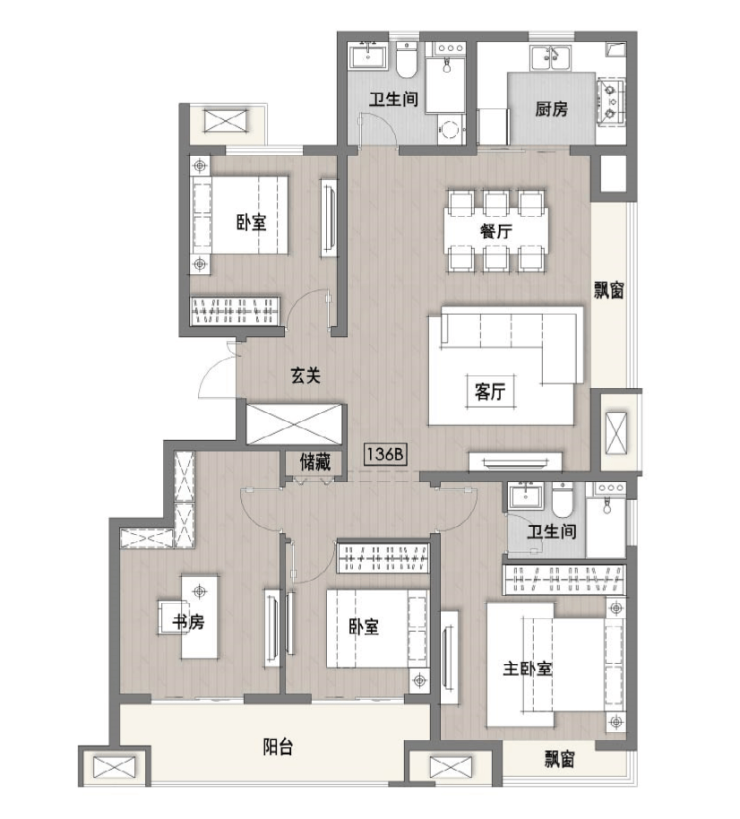一体式联动餐客厅,享大尺度揽景飘窗,通透自然;