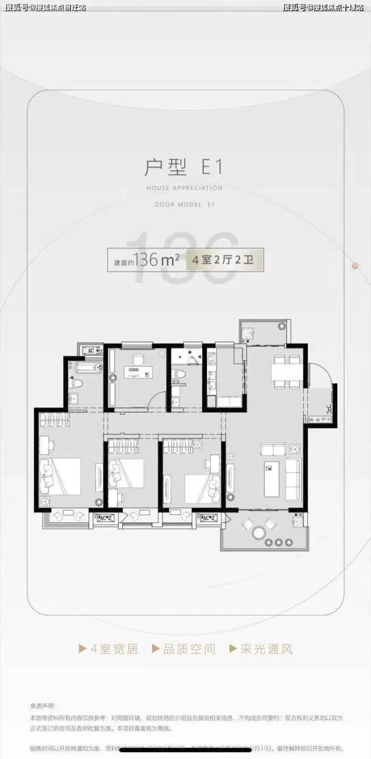 以约136m²的空间,四面采光格局,让每一个卧室以及客厅都能充分享受阳光的宠爱,打造人与阳光相处和谐的光环境生活家。整体户型270度的采光面,更带来通透舒畅的布局,冬日暖阳,夏天畅风,奢享健康生活。适应百变家庭,各享私有空间,动线合理,生活互不打扰。奢阔主卧自带独立卫浴,男女主人可以独享私密的二人世界。3.9米面宽客厅,聚齐全家的欢乐时光,生活的温度,在此呈现。
