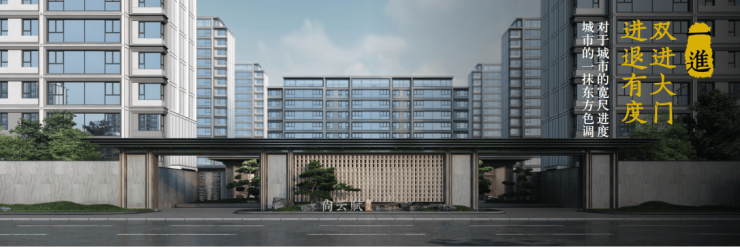 香槟色仿木精构+灰色铝材斜面格构+浅色涂料留白
