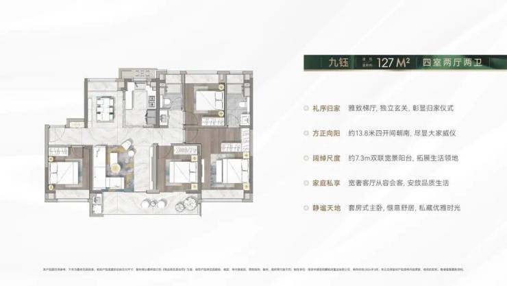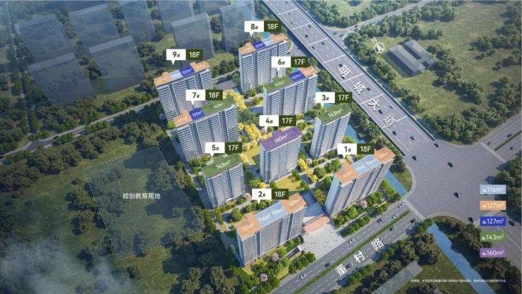 项目规划9栋17-18F小高层,九境园林景观规划,打造建筑面积约116-160m²纯板式大宅,没有连廊,类一梯一户,外立面采用铝板+大面积玻璃打造简奢造型南北双立面,匠著百家湖纯粹改善。