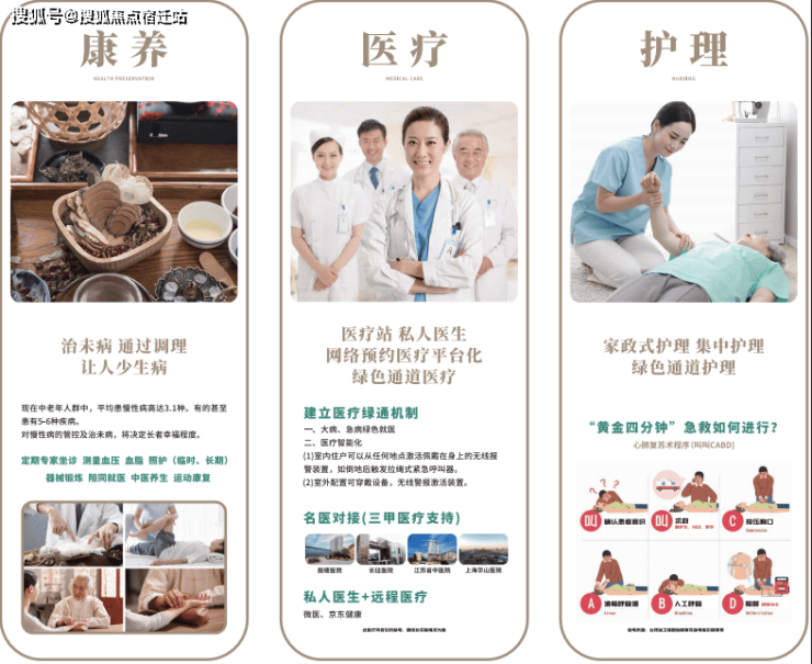 联合专业的医护团队,从医疗、康复、护理三个维度给老年人提供长者建档、互联医生、专家问诊、指标监测、绿色医通、介助介护、康复训练、健康讲座、心理疏导等9项医护内容;