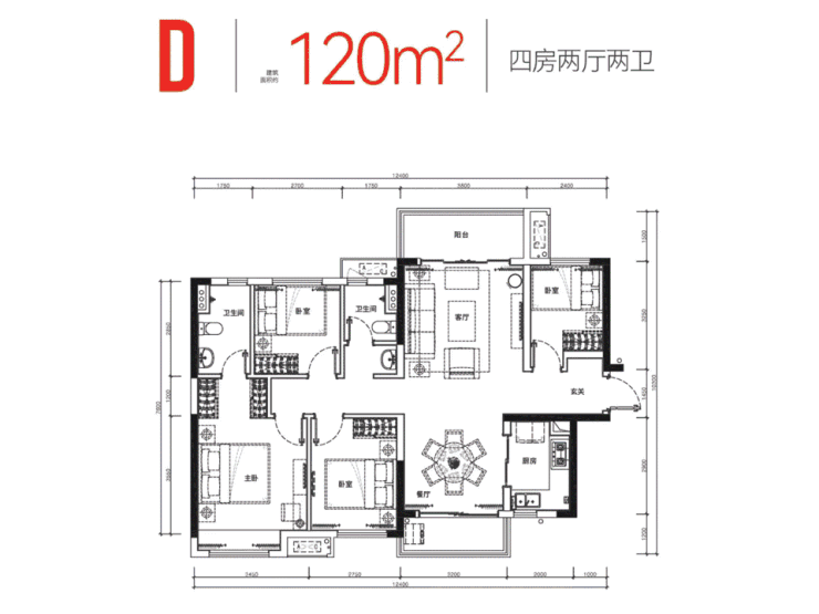 建面约120㎡四居室为D户型,入户玄关提升了室内私密性,紧挨着玄关的次卧做成长辈房或者书房等空间都是不错的选择;约7.6米一体化客餐厅很气派,在家里宴请亲朋好友完全没问题。