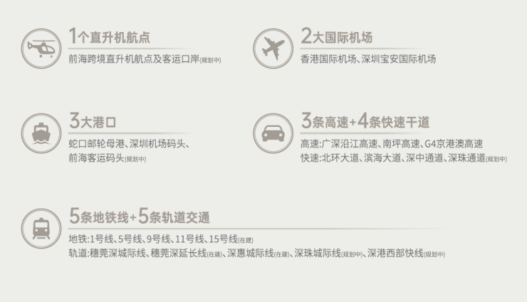 打造前海国际交通枢纽,“海、陆、空、铁、轨、直”六大维度交通体系,便捷深港往来,加速粤港澳大湾区互联互通,执掌全球商务效率。