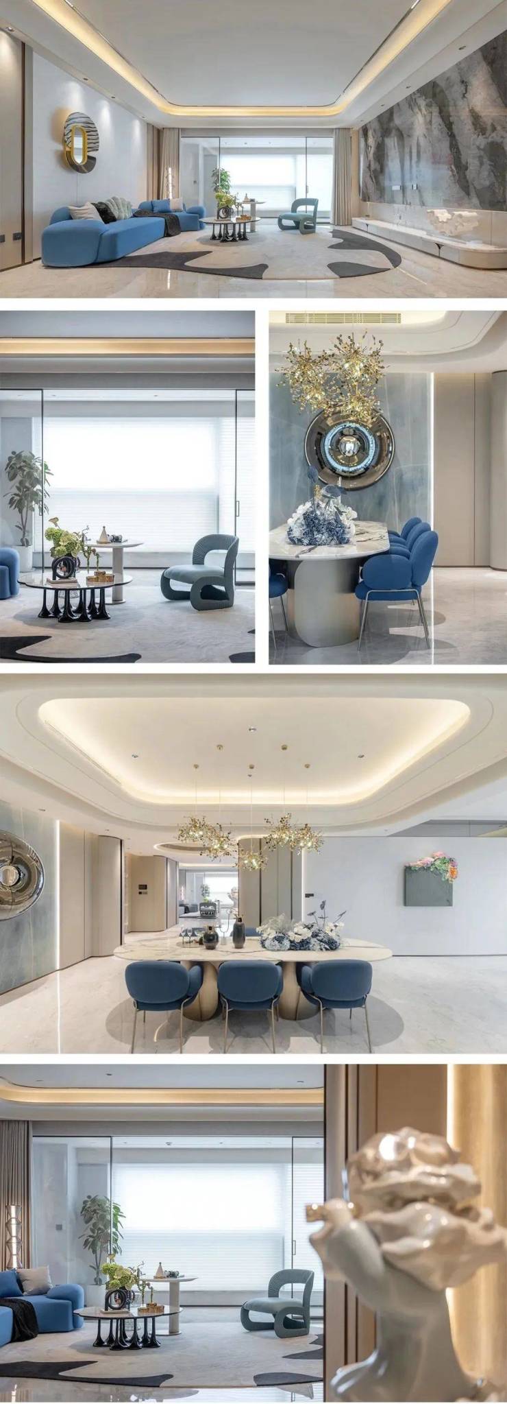 步入样板房内,目之所及,遍布芬迪白、喜马拉雅灰、雪山蓝等名贵奢石,将“浮华”二字堆砌得恰到好处;除此之外,大量深色木饰面的运用,则让整体风格显得低调而沉稳。吊顶、墙面,随处可见的弧形元素,炫技的同时又增添了温馨调性,奢华中带着松弛感。