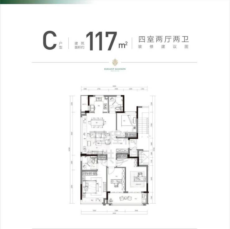 117㎡边套为四室两厅两卫,三开间朝南+南向双开间阳台。在洋房得房率的加持下,套内面积比肩高层建面约130㎡户型。