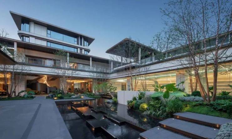 隐匿于都市繁华之中,下沉庭院被葱郁自然与静谧院落环抱,与绿意盎然的植物交织成一幅生机勃勃、变幻流动的自然画卷,带来层次丰富、美不胜收的视觉享受。
