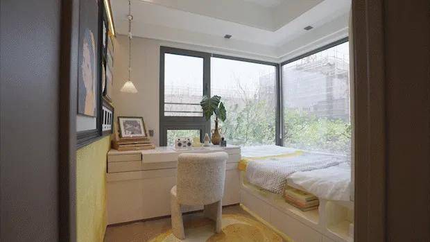 次卧实现270°L型飘窗,双向窗户采光,可以轻松拓展出书桌及收纳空间,尺度感非常不错。