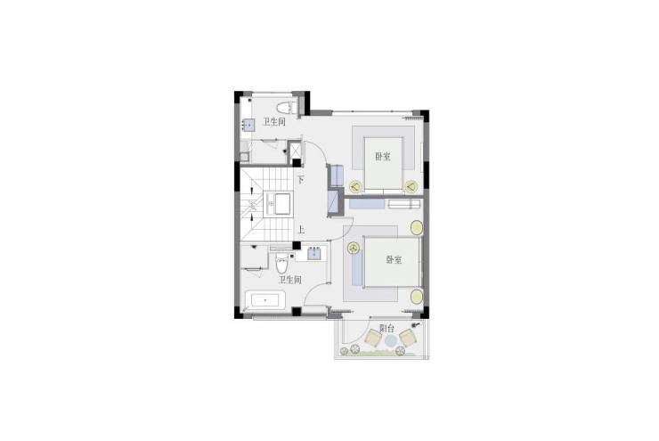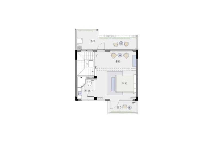 二楼是含主卧在内的双套房。三楼是次卧+多功能房+南阳台,北向还有一处观景大露台。