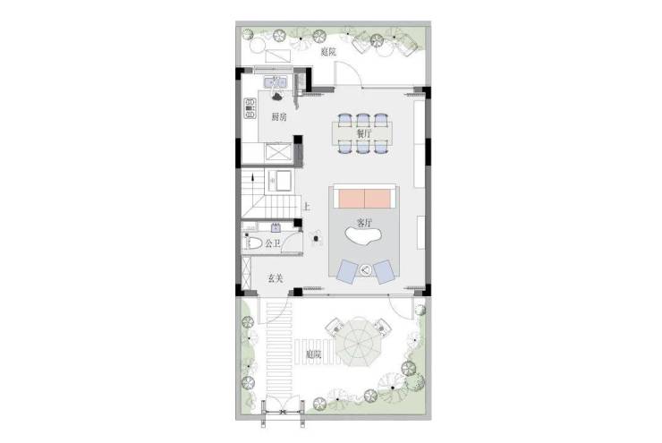 主力约155㎡合院,3+1房设计,一楼是带大幅落地窗的餐客厅,南北均直连270°环形庭院,面积约60—70㎡。可莳花弄草或略种时蔬,拥云山入怀。