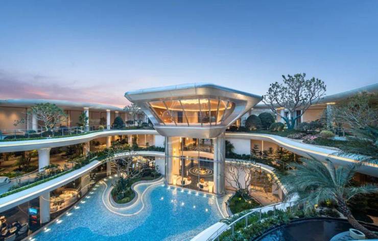 项目位于杭州未科板块,全抬板社区,元序通过五重景观环岛,将园区整体抬升约5米,2楼相当于普通住宅4楼,架空层最高达约6.3米。得益于此,业主可穿梭于三层立体式景观水院,超2500㎡景观水系之中,层叠错落间,仿佛行走于“悬浮于城上空的绿洲”。