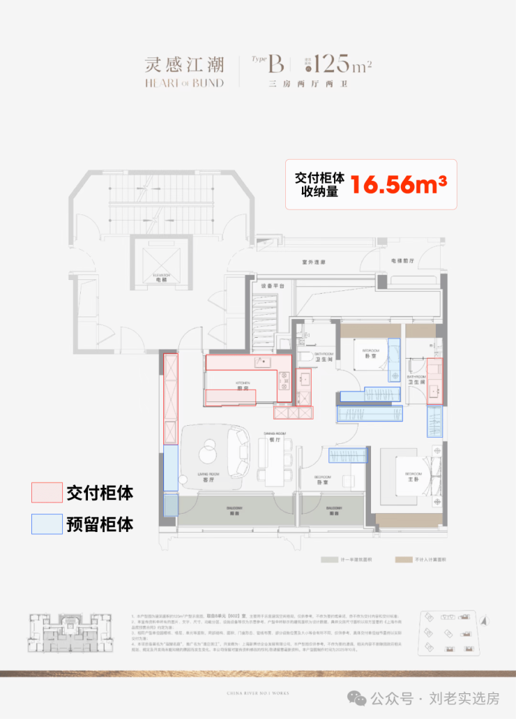 据小编手工统计,项目125㎡3房边套户型的整体交付柜子+预留衣柜, 收纳空间可以达到约20.04m³! 中间套户型也能达到约16.56m³!