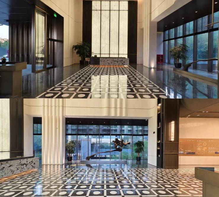 从入户的自动门进来后,咱们便能看到大约2层的入户通体大堂,配合透光灯箱和十字花瓷砖的海派装修。