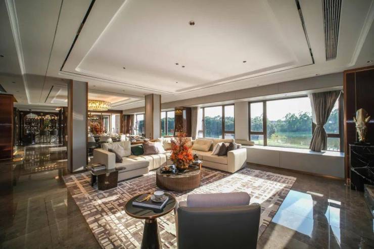 回到室内,约5.5米开间、6.4米挑高客厅,LDKB一体化设计,空间奢阔大气。走进家门,一线高尔夫湖景就是客厅的天然背景画。