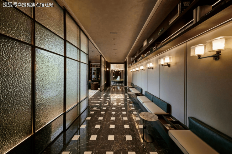 门庭巨幅奢石景墙,与光影交织,尽显奢雅。并且它还不是普通奢石,它的等级更高。每一块「百达翡绿」都是精挑细选,几何的构建、才有了现在如翡翠肌理的立体效果,这是普通石材铺装完全不能比拟的。