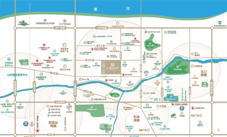 5.医疗:项目往东约三公里为“师范路医疗中心”,汇聚了济南第四人民医院、解放军960医院(原济南军区总医院)及济南中西医结合医院,医疗配套完善,同时项目以西约2公里规划西部国际医学中心,规划建立20余家高端医院。