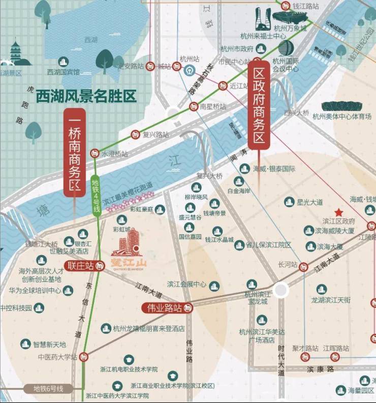 •路网通达:江南大道、彩虹快速路、钱塘江大桥、望江隧道等,从容通达全城