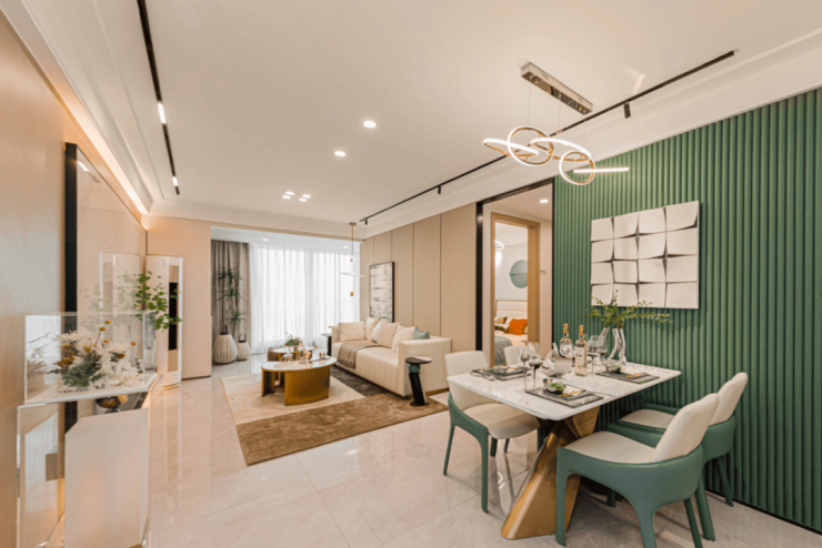 项目建面约89㎡全能三房,客厅、餐厅、阳台相连,既延伸了生活的宽度,也体现了生活的高度各功能分区明晰,却又确保空间相融。有效利用空间视觉上大幅提升客厅的开阔感,四时美景与欢声笑语相伴,便是给予“爱”最好的落脚之处,对于家的美好幻想,尽归于此。