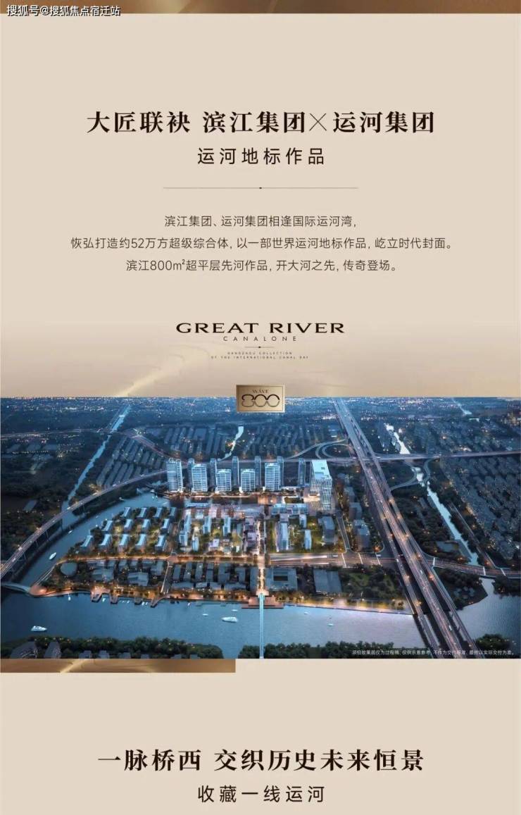 项目位于杭州拱墅区运河新城核心区,独占京杭大运河1.2公里岸线,以“一层一户、一层一景”的极致设计理念,主卖400-800㎡超平层产品,价格2.2万左右,标准层层高3.8米,定位为杭州新一代财富阶层的顶豪资产。