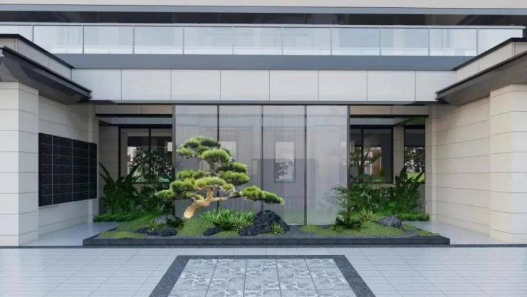 地上单元入户景墙,提升了灯光、金属格栅、花境的效果,增加了透光性更好、更有意境美的玻璃屏风,并为不同单元入口甄选不同树种,用专属的风景指引业主归家。