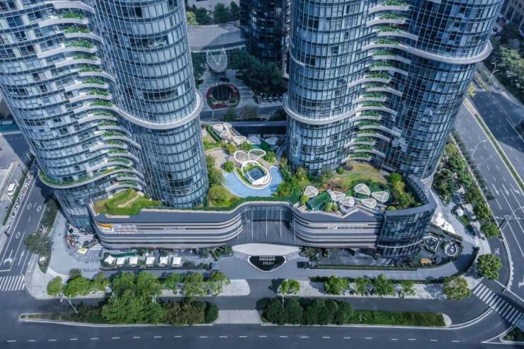 维持建筑原有结构的弧线美感,并将其由鸟瞰视角的美延续至人视可见的街景。建筑形体如两座耸立秀美的茶山,散发杭州特有的气质。山形建筑之下,裙楼屋顶被整体设计为开放式花园,使建筑、绿植、公共景观相互串联,成为隐藏在城市中的桃源绿谷,为使用者提供独特的空间体验。