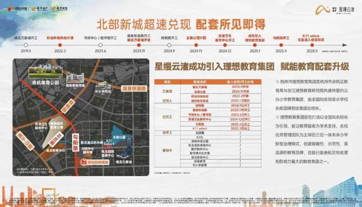 2025年1月2日,余杭区教育局、杭州市理想教育集团、星缦云渚项目公司三方正式签约合作办学。由理想教育集团全面管理地铁越秀·星缦云渚配套小学,实施名校集团化办学。理想教育集团总校长俞国娣女士全面管理,力争将该校打造成为区域标杆学校,助力余杭区公办教育优质均衡发展。