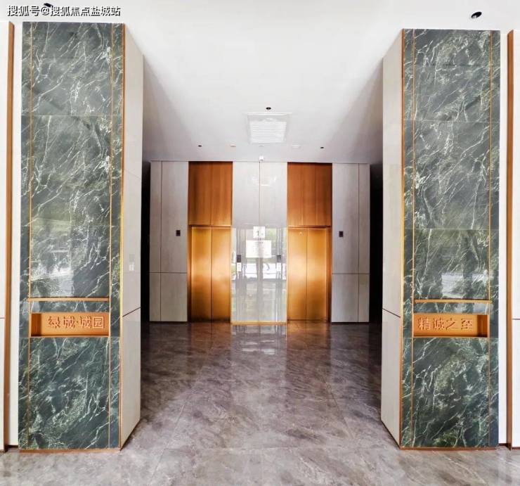 电梯前室理石上墙,采用仿普拉达绿通体砖,冰砖样式为施华洛世奇级别,排面十足。