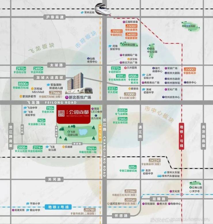 项目地处飞龙板块核芯,北邻新北万达商圈,南靠市芯商圈,精英资源荟萃;与新北飞龙吾悦一路之隔,周围新北万达广场、麦德龙广场等商综林立;飞龙社区卫生站、阳光康复医院、三井人民医院等医疗资源环伺;通江路、长江路、龙城大道等主干道环伺,紧邻常州地铁3号线(规划中),距离飞龙公交站约100米,立体路网,速抵全城。