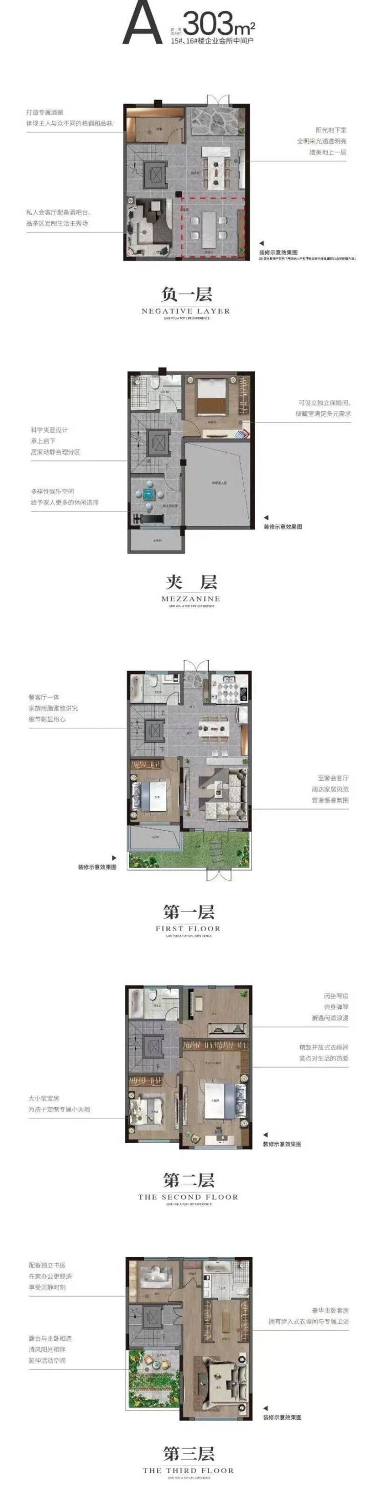 项目采用类五层设计,前后约60㎡双庭院,拓展更多生活维度;约5.1米挑高地下空间可随心打造为家庭影院、健身房、酒窖或收藏室,满足多元生活想象。无论是三代同堂的天伦之乐,还是朋友相聚的热闹派对,亦或是独处时的静谧时光,在这里都能找到最舒适的打开方式。