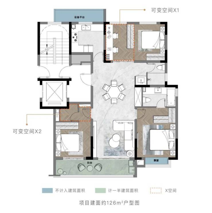 该建面约126㎡户型南向宽厅三开间的格局同样堪称惊艳。整个户型设计方正,九宫格式布局,所有房间以双厅为核心相互连接,没有过道空间浪费,实现玄关-客厅-餐厅-厨房-主卧-南次卧-北次卧-2X空间-主客双卫。11个空间,独立成型,尺度舒适,兼顾了功能性和生活质感。洋房的高得房率加上私享电梯前室的利用空间,这款126㎡户型,在同等面积的户型中必然是王炸的存在!