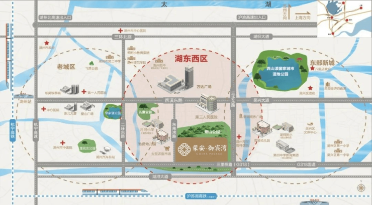 紧邻三环东路、G318沪聂线,通达三环北路、沪渝高速、杭长桥中路等,同时湖州互通、沪苏湖高铁湖州东站(在建)组成全域进出的交通枢纽,共同打造湖州一小时经济都会圈,纵享极速出行