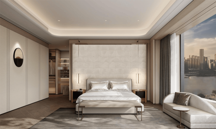 灯光设计也更进一步,从功能使用走向氛围重塑、走向景观形意表达——光线经过N次漫反射,才清雅柔和地覆盖在空间之中,提供均匀、典雅、无眩光的健康光线,同时,最大限度地考量外部景观视野与内部空间的联结,真正将节能环保的绿色居住理念融入其中,成为情绪价值的营造者。