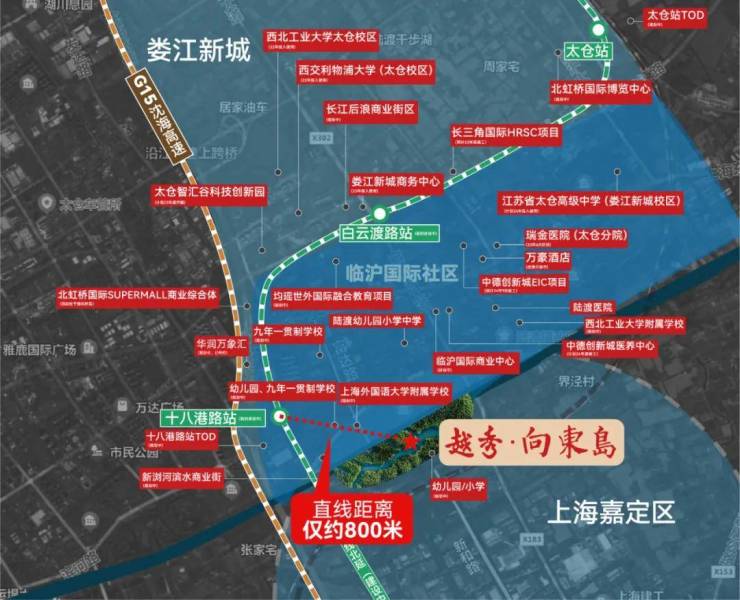 越秀·向东岛位于上海嘉定区与太仓市交界处,南门为上海嘉定区、北门为太仓娄江新城,拥有上海新和路1558号和太仓富达路1号双城门牌号,生活半径归于上海。