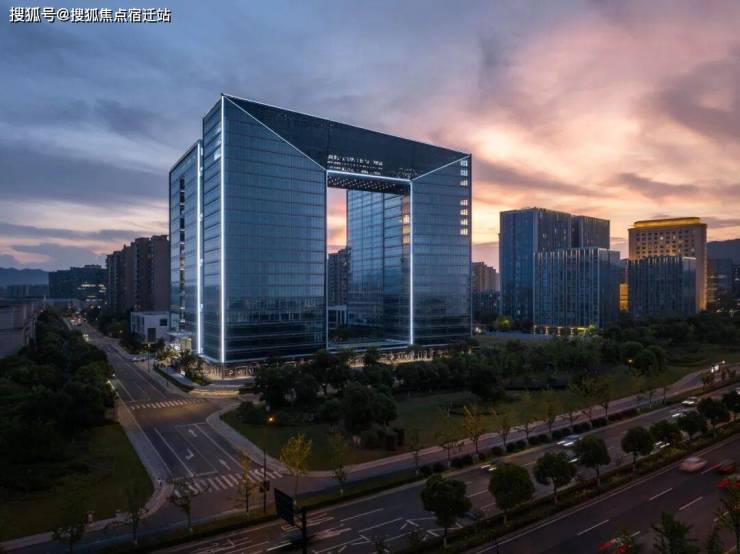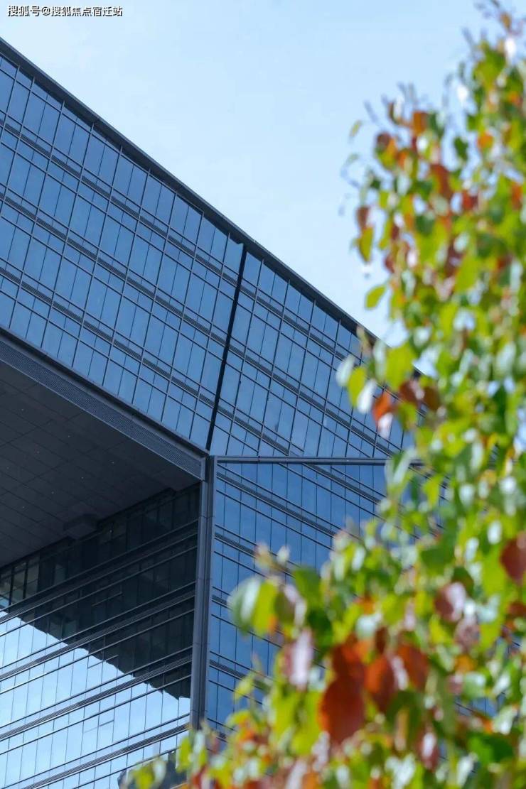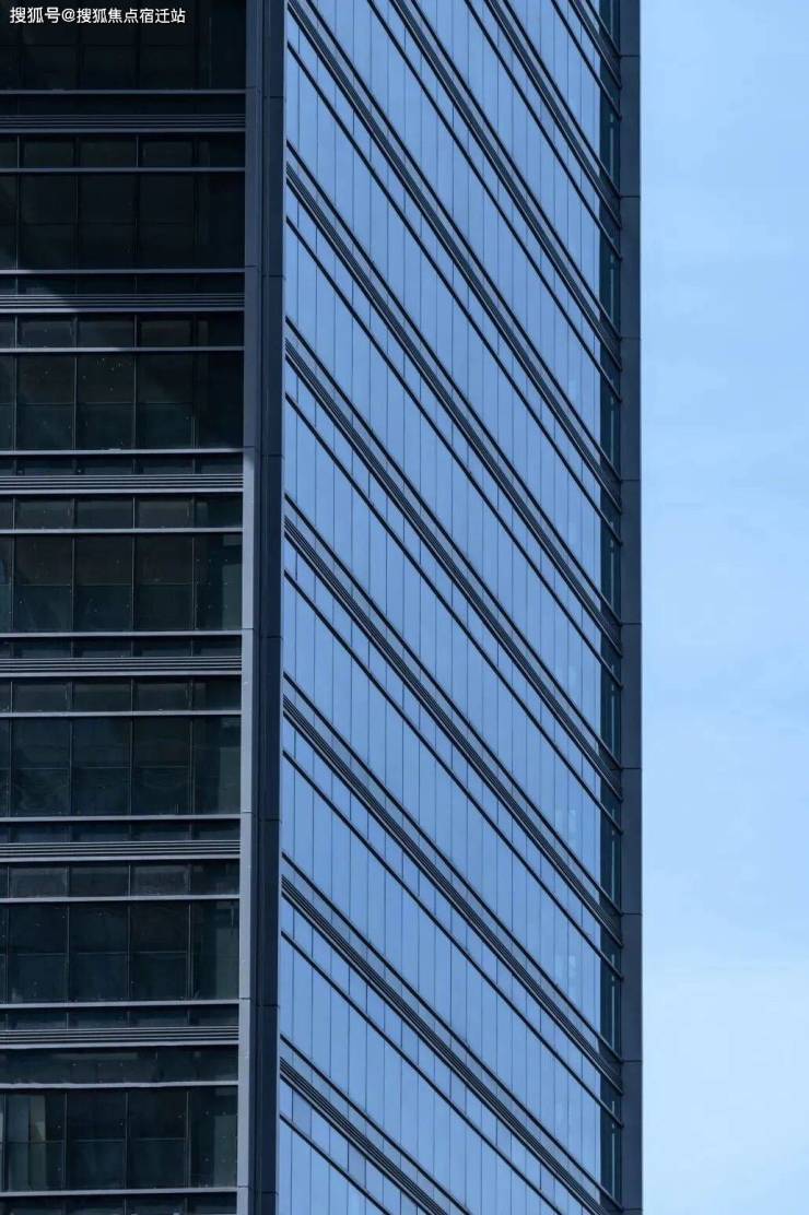 全幕玻璃和拼配铝板,搭配游走交叉的金属线条赋予建筑物通透干练的效果,转角内约5.3°的微斜切面,视野更好,造型也更加流畅灵动。