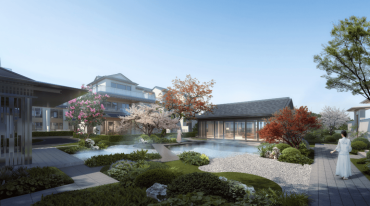 将园林分为雅集、游园两部分,前半部分为中心景观区,融宋代文人居住精神与现代社区宴客的功能,将“雅集之美”娓娓道来;后半部分以“文人行旅”为主题,以山水游园环线串联 8 大主题院落,构建景观与文化的链接,让建筑在自然中生长,自由灵动的山水游园式景观。