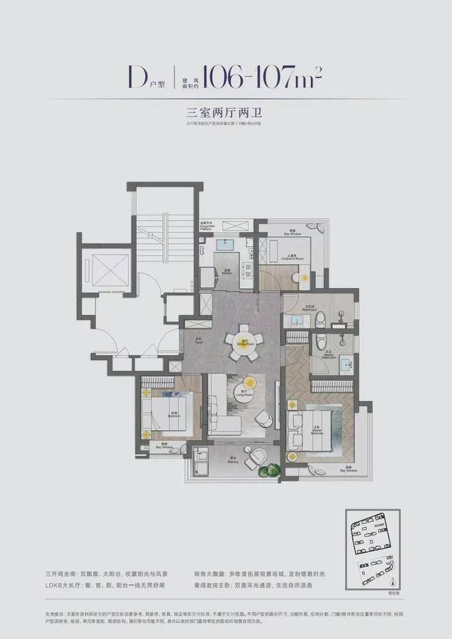 在这个飞机户型的基础上,D户型边套升级了270度的飘窗。而且是南主卧和北次卧都带了270度景观。