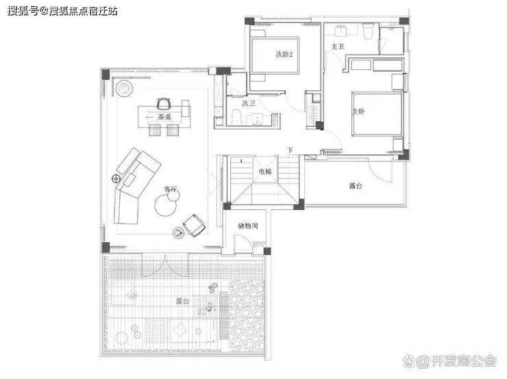 二层设置客厅、茶室,两间卧室,其中每间卧室设置独立卫生间,其中一间卧室享有超大面积露台。